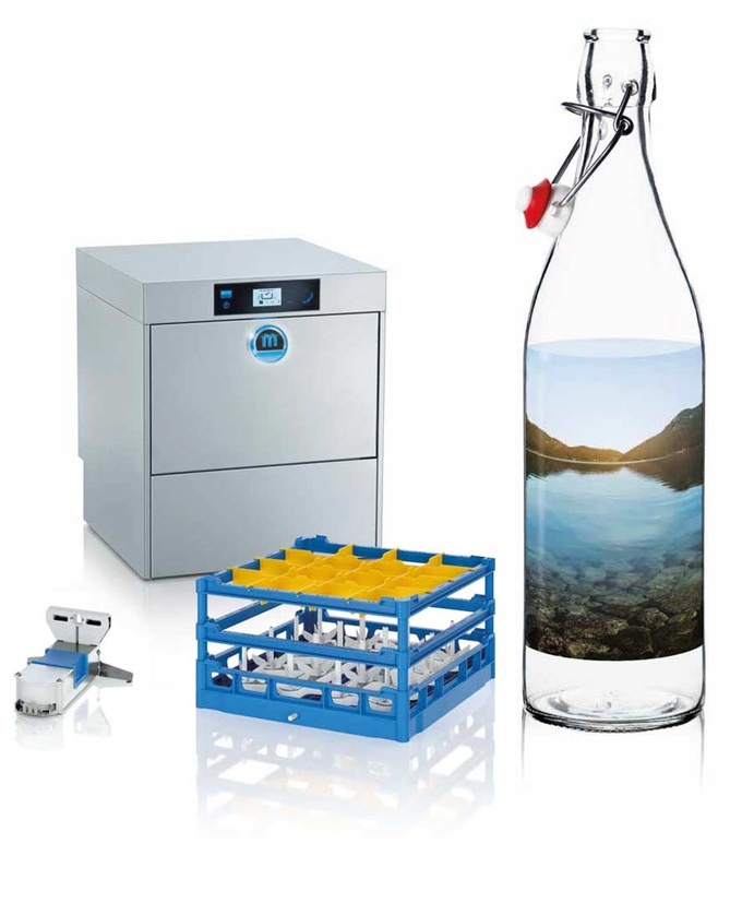 The best part is that the bottle rack system fits any M-iClean UM and UM+ undercounter dishwashing machine (models from 2013 and after) and is child’s play to switch in and out. That means you can be flexible when the make up of your washware changes suddenly. The benefits are obvious: this tested process is resource efficient, reduces payroll costs, saves time, ensures hygiene safety and, of course, complies with DIN regulations (SPEC 10534).